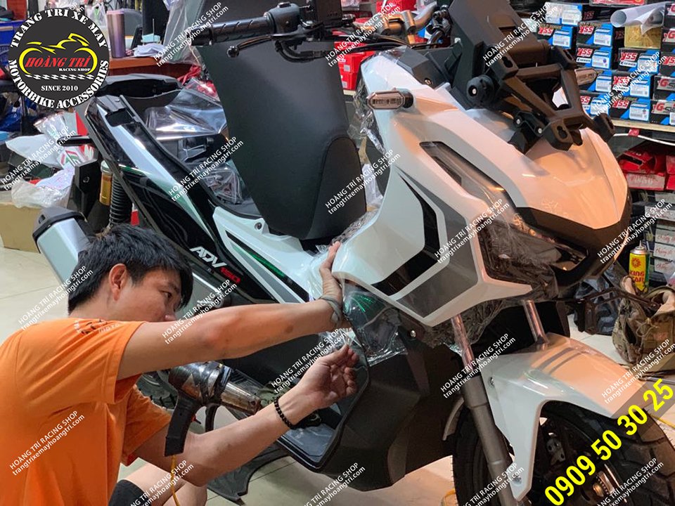 Tiến hành dán: Kỹ thuật viên sử dụng máy sấy và các dụng cụ chuyên dụng để dán keo xe hoặc tem trùm mà không bị bọt khí.